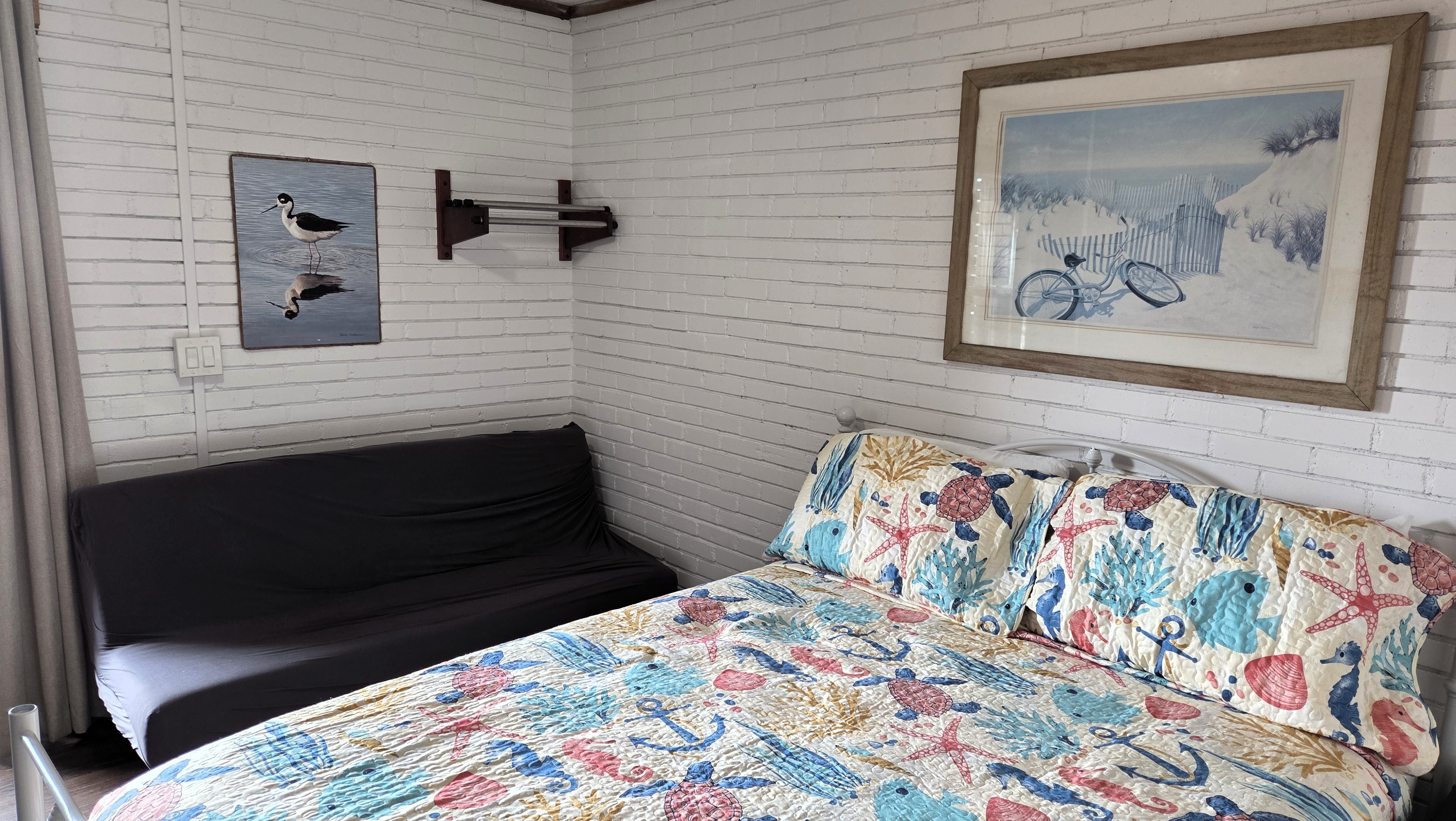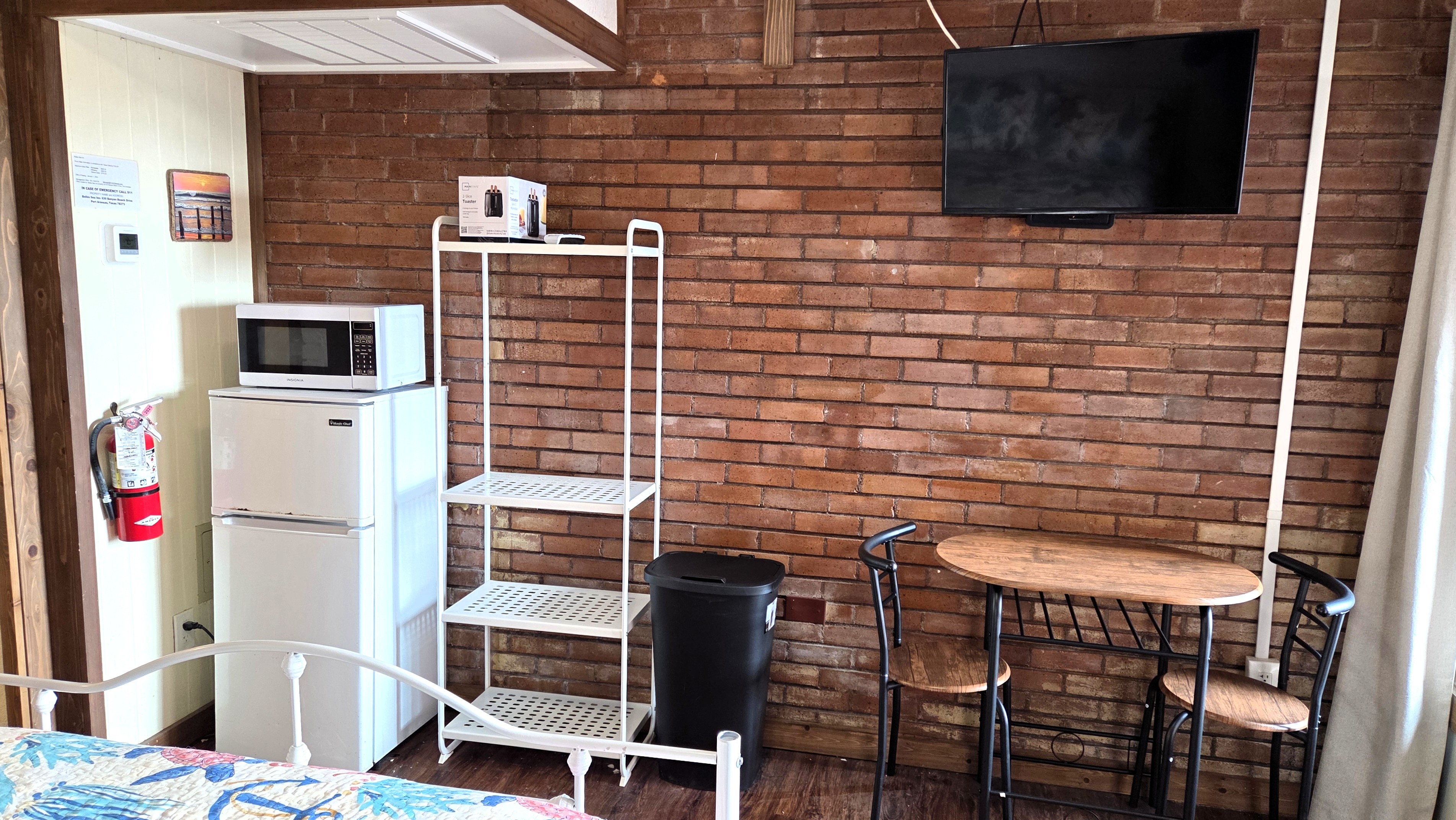 Room 105 is a studio with a living room, a full bath, a refrigerator, microwave, and a drip coffee maker. The room sleeps up to two adults and two children. The living area has a queen bed, a futon, and a small dining table. A television with DirecTV and wireless internet are included with your stay. Paper products, soaps, and linens/towels are provided.