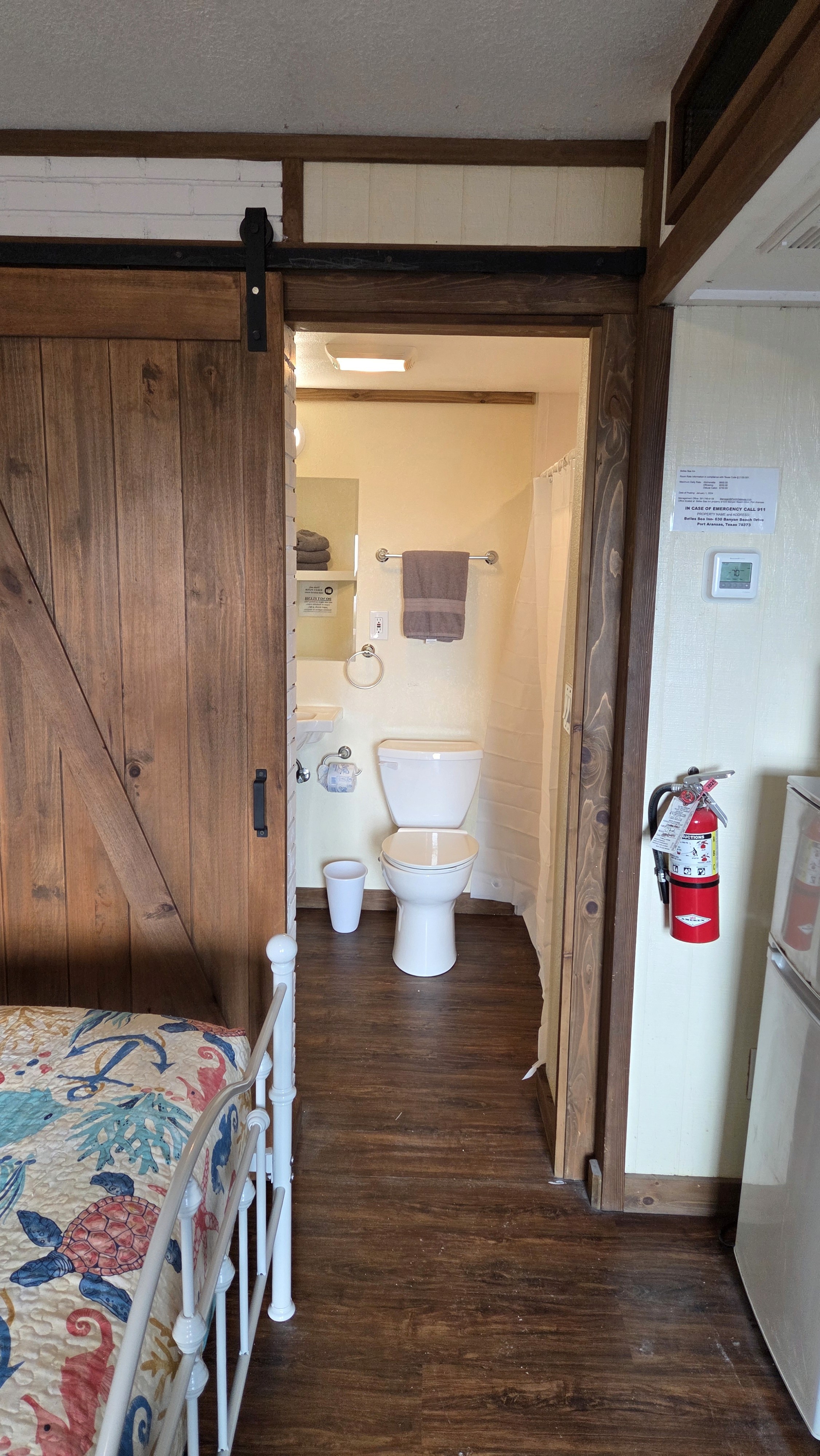 The full bath features a walk-in shower, toilet, and vanity. Towels and basic soaps are provided.