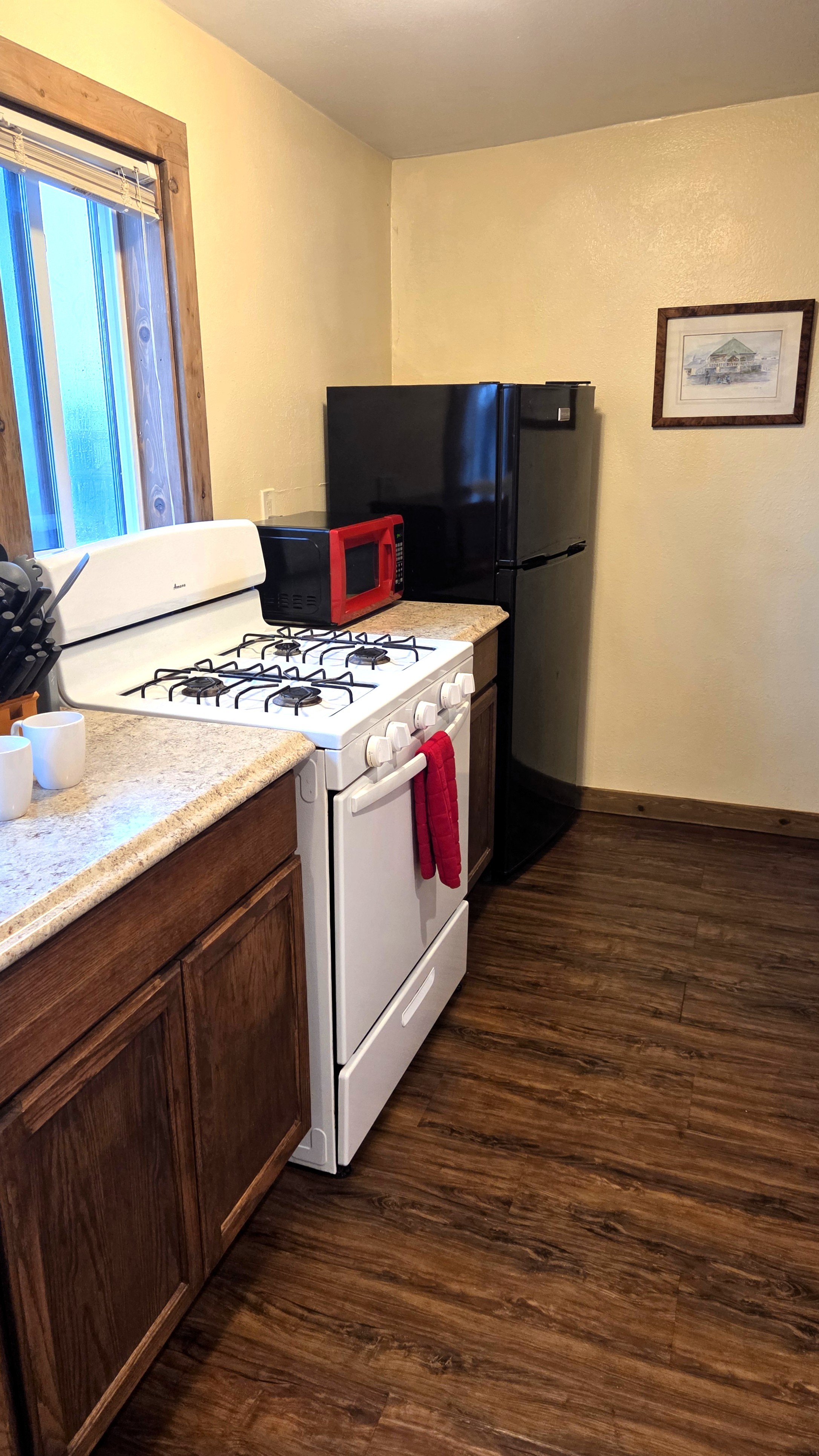 Next to the living area is the full kitchen with a refrigerator/freezer, a gas stove, a microwave, a drip coffeemaker, and all of the kitchen basics for cooking. Paper products, soaps, and linens/towels are provided.