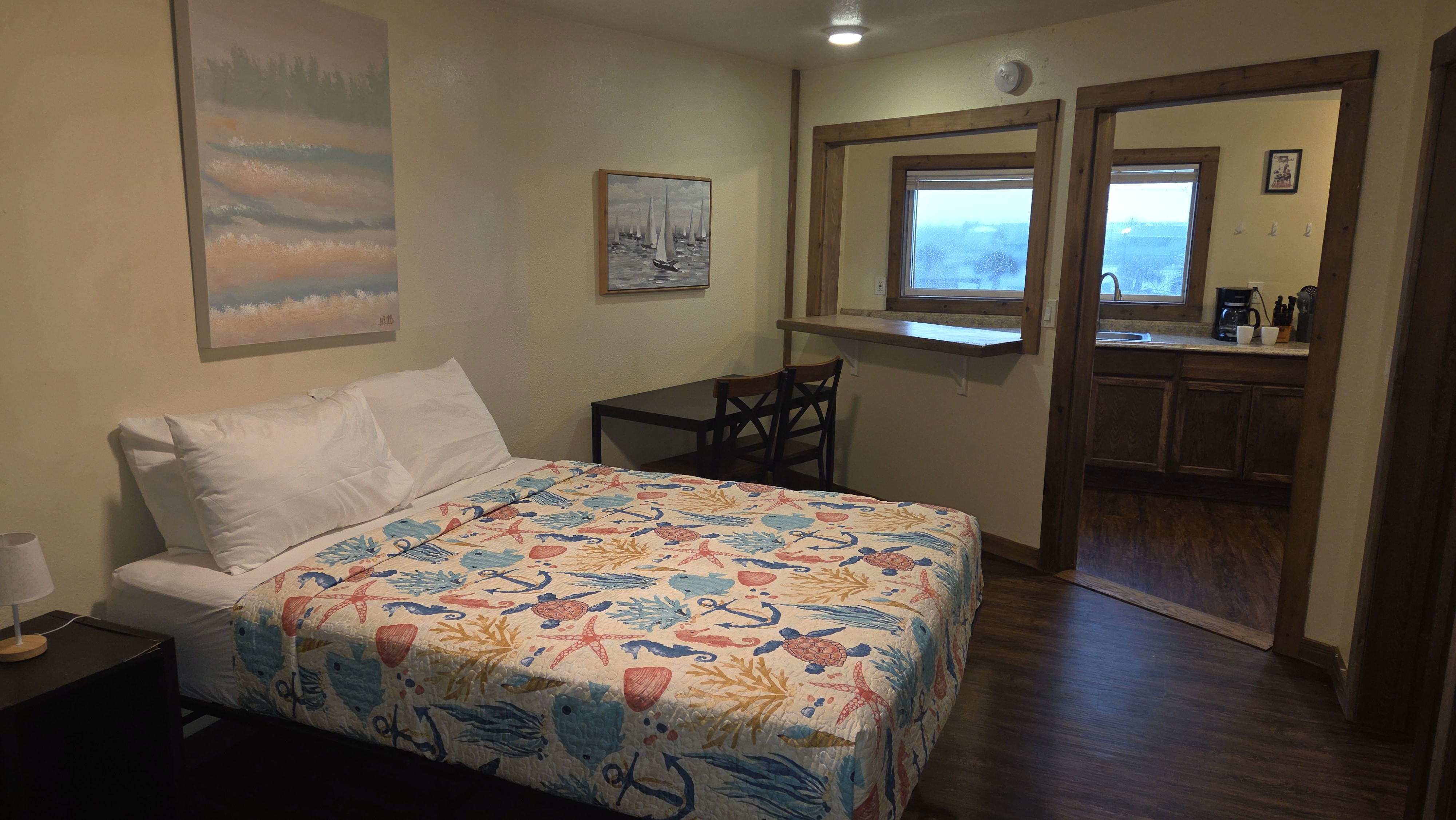 Room 108 is an efficiency apartment with a living room, a full kitchen, a full bath, and an ocean view from the kitchen. The room sleeps up to two adults and two children. The living area has a queen bed, a futon, a small dining table, and a closet. A television with DirecTV and wireless internet are included with your stay.