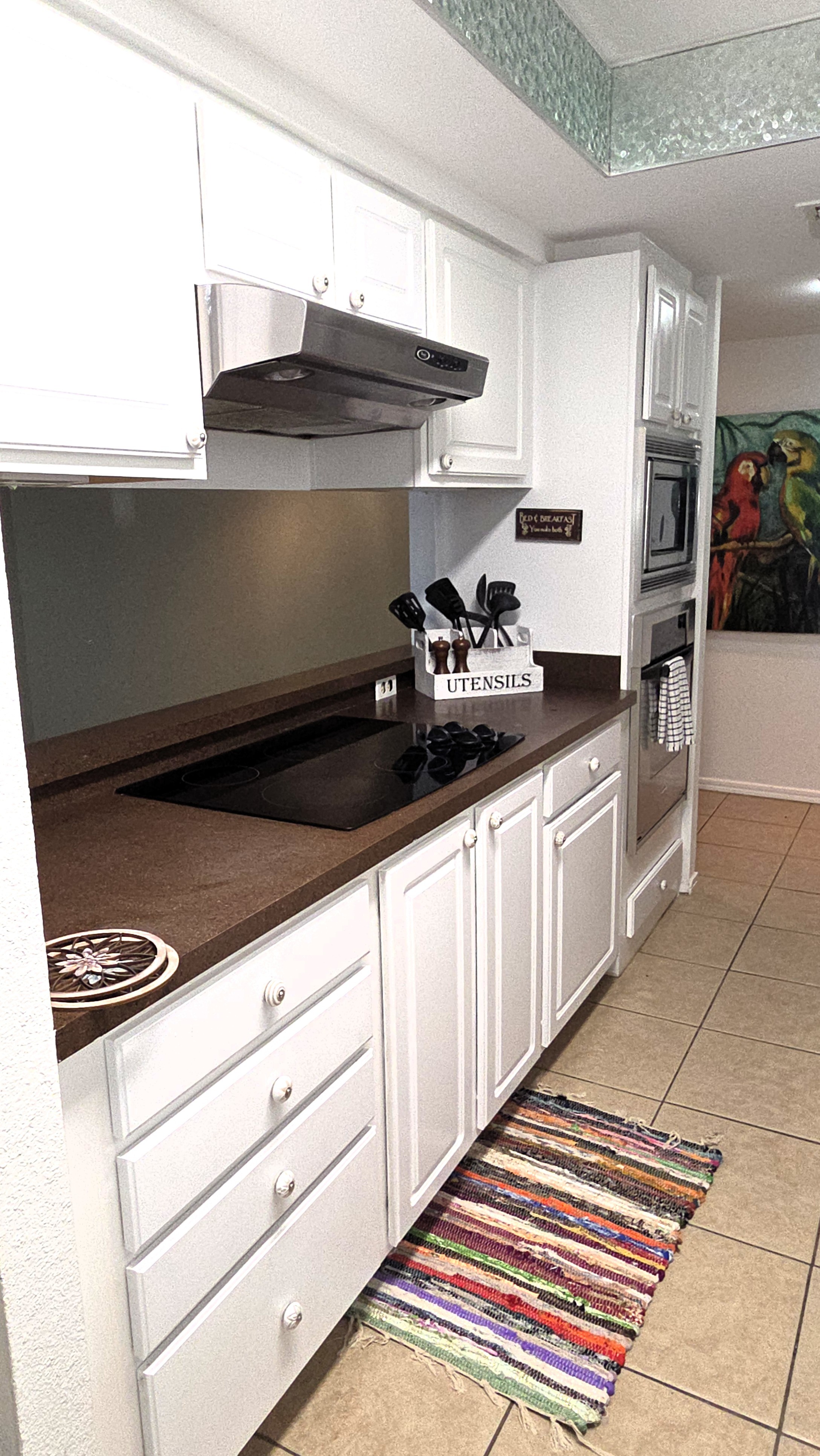 Down the hall, you'll find the full kitchen with granite counters, stainless appliances, and plenty of room to cook the catch-of-the-day. Appliances include a refrigerator, electric range, microwave, dishwasher, a drip coffee maker, and other small appliances. Basic cookware, kitchenware, soaps, and paper products are included. There is also a laundry closet with a full size washer and dryer.
