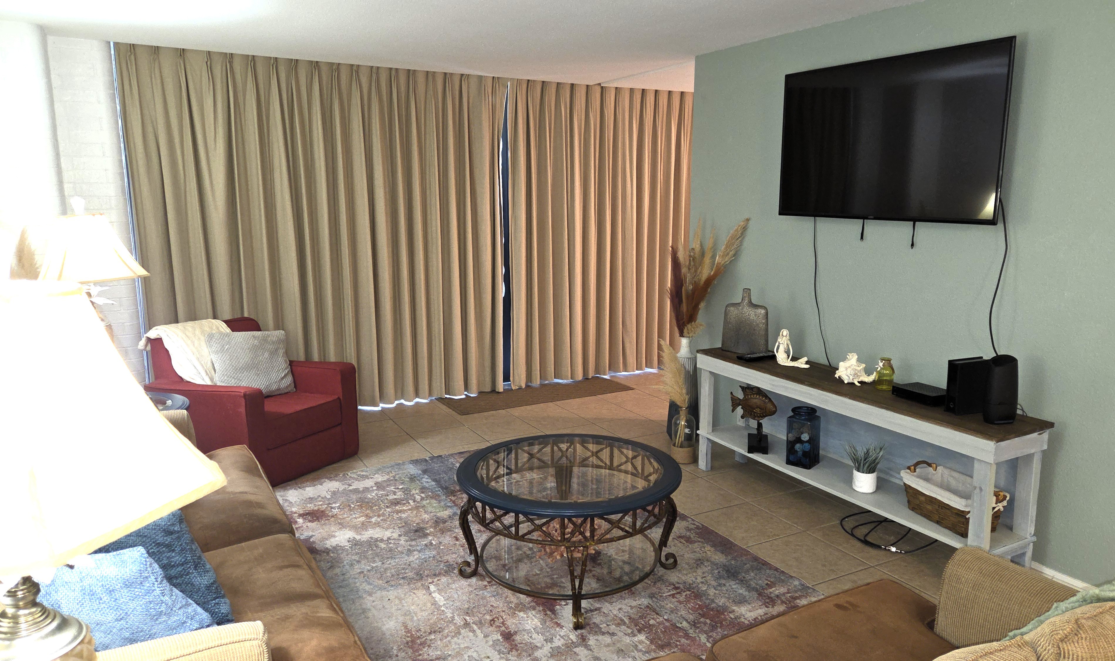 When you enter, you're greeting by a stunning view of the Gulf through the window wall in the main living room. The spacious living and dining areas are a great place for games, a movie, or just to relax after a day of fun in the sun. The dining table seats 6 and there is a small breakfast bar that seats two additional guests. The living room has a large smart television with cable and internet streaming options. There is a full sleeper sofa to accommodate additional guests. Wireless internet is included with your stay.